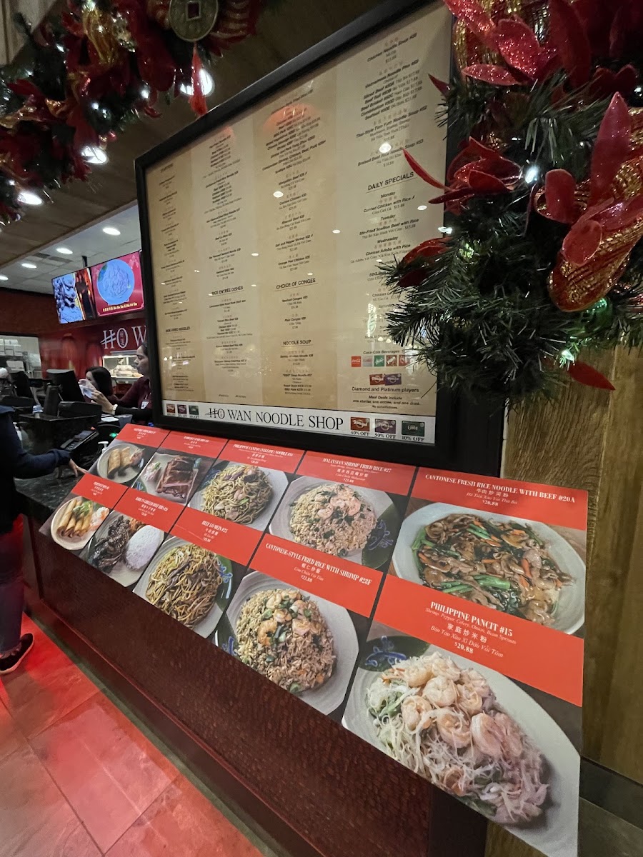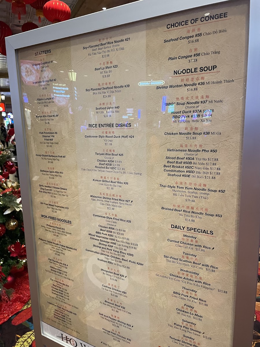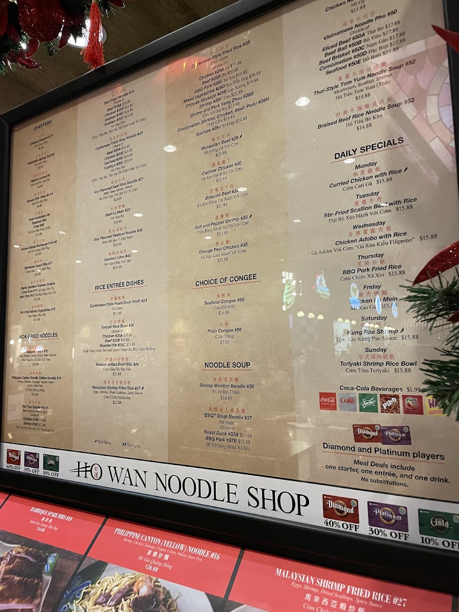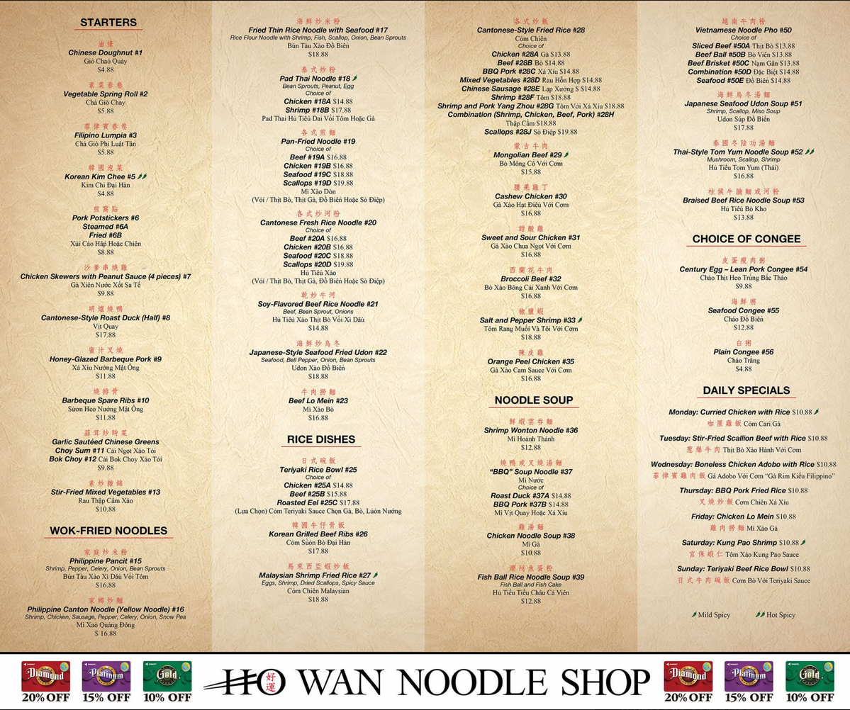 From a reviewer’s perspective, the menu at Ho Wan Noodle Shop offers a satisfying variety of Asian comfort dishes, even though prices are not listed. The starters like Chinese Doughnut, Vegetable Spring Roll, Filipino Lumpia, Korean Kim Chee, and Pork Potstickers (Steamed or Fried) set a flavorful tone, while the wok-fried noodle section stands out with options such as Philippine Pancit, Philippine Canton Noodle (Yellow Noodle), Fried Thin Rice Noodle with Seafood, Pad Thai Noodle - Chicken, and Pad Thai Noodle - Shrimp. For heartier meals, the rice dishes-including Teriyaki Rice Bowl - Chicken, Teriyaki Rice Bowl - Beef, Teriyaki Rice Bowl - Roasted Eel, Korean Grilled Beef Ribs, and Malaysian Shrimp Fried Rice-deliver both variety and depth. The noodle soup selection, featuring Shrimp Wonton Noodle, BBQ Soup Noodle - Duck, BBQ Soup Noodle - Pork, Chicken Noodle Soup, and Fish Ball Rice Noodle Soup, adds comforting options, while the congee choices like Century Egg - Lean Pork Congee, Seafood Congee, and Plain Congee round out the menu nicely. Daily specials such as Monday - Curried Chicken with Rice, Tuesday - Stir-Fried Scallion Beef with Rice, Wednesday - Boneless Chicken Adobo with Rice, Thursday - BBQ Pork Fried Rice, and Friday - Chicken Lo Mein provide rotating highlights, making the menu feel both diverse and consistently appealing.